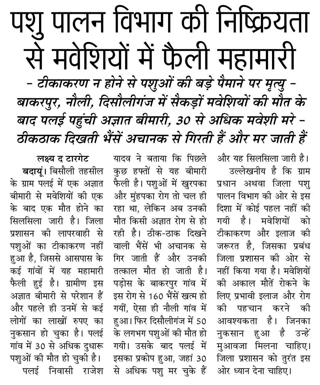 बदायूं, 02 फरवरी, 2022: बदायूं जिले की बिसौली तहसील में ग्राम पलई पिछले तीन सप्ताह से एक अज्ञात महामारी से जूझ रहा है। गांव में अज्ञात बीमारी से मवेशियों की एक के बाद एक मौत होने का सिलसिला जारी है। जिला प्रशासन की ओर से कोई ठोस कार्यवाही नहीं किए जाने के चलते गांव वाले न सिर्फ चिंता में जी रहे हैं, बल्कि अनेक किसानों को लाखों रुपए की चपत लग चुकी है। पशुओं का टीकाकरण न होने की वजह से मवेशी मर रहे हैं, जिनमें गायों के अलावा ज्यादा संख्या में भैंसें हैं।